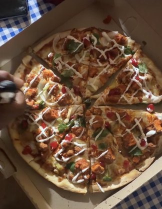 Queso mozzarella, salsa de tomate, boneless búfalo, apio, cebolla, cilantro, cereza y aderezo Ranch.