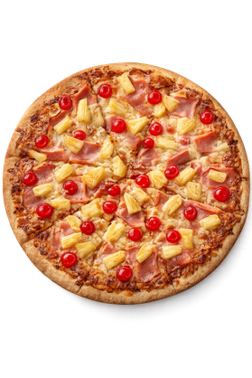 Queso mozzarella, jamón, piña, cereza y salsa de tomate