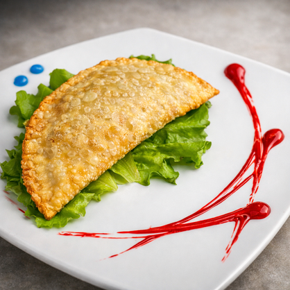 Empanada crujiente elaborada con masa dorada y relleno tradicional al estilo chileno. Servida sobre hojas frescas con un toque de salsa gourmet.