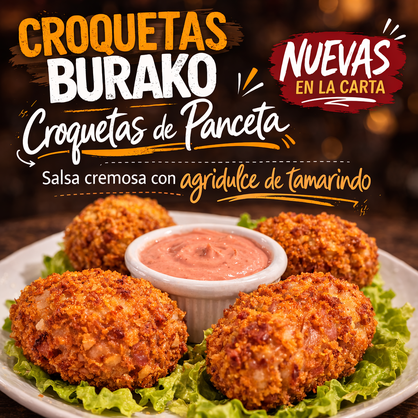 Crujientes croquetas de panceta apanadas en panko, rellenas con chicharrón , ligado en suave bechamel y aromatizadas con especias naturales. Se sirven con una salsa cremosa con agridulce de tamarindo que equilibra perfectamente su sabor intenso y crocante.