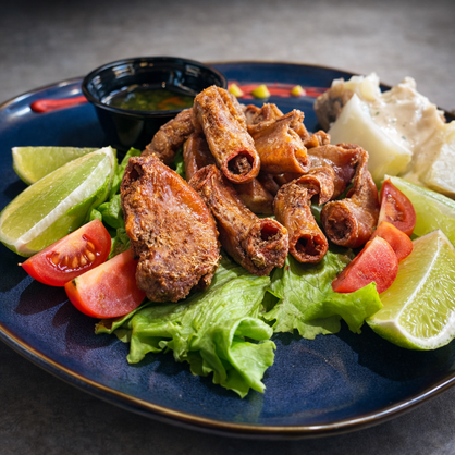 Chunchullo dorado a la perfección, crocante por fuera y jugoso por dentro, servido sobre un lecho fresco de lechuga y tomate. Acompañado de papa criolla cocida, gajos de limón para realzar su sabor y salsa de la casa para un toque final irresistible. Un clásico de la cocina tradicional, elevado con presentación y carácter.