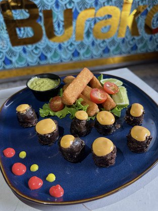 Morcilla dorada a fuego lento, acompañada de yuca crocante que aporta textura y contraste. Se sirve con una salsa ahumada de pimentón, cuidadosamente elaborada para resaltar los sabores intensos y equilibrar el conjunto con notas profundas y envolventes.