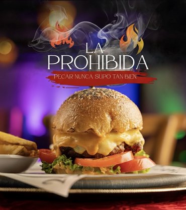 Hamburguesa de res con chicharrón crujiente y maduro caramelizado, queso fundido y alioli ahumado artesanal. Acompañada de papas doradas, esta creación armoniza textura, dulzor y notas ahumadas en una experiencia gastronómica memorable.